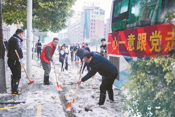 湖南省邵陽(yáng)市隆回縣近日遭遇罕見(jiàn)冰雪天氣,縣政協(xié)適逢舉行十屆二次全會(huì),第一時(shí)間響應(yīng)縣委、縣政府號(hào)召,組織參會(huì)的320余名委員分11個(gè)清掃組集體上街清雪除冰。圖為2月23日,委員在清除路面積雪。 肖若儲(chǔ) 攝