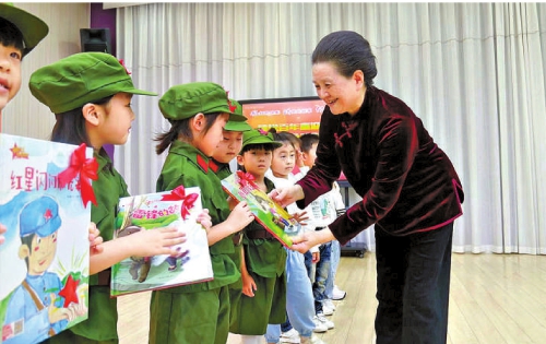 郭建華走進開封市金明幼兒園,向孩子們贈送圖書。