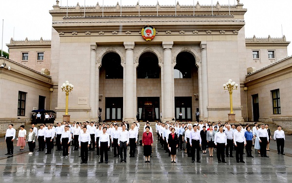 7月1日,全國(guó)政協(xié)機(jī)關(guān)在全國(guó)政協(xié)禮堂(中共八大會(huì)址)前舉行升國(guó)旗儀式,慶祝中國(guó)共產(chǎn)黨成立101周年。全國(guó)政協(xié)副主席兼秘書長(zhǎng)、機(jī)關(guān)黨組書記李斌出席。全國(guó)政協(xié)副秘書長(zhǎng)、機(jī)關(guān)黨組副書記鄒加怡主持儀式,駐會(huì)副秘書長(zhǎng)、機(jī)關(guān)黨組成員、專門委員會(huì)駐會(huì)副主任、有關(guān)部級(jí)領(lǐng)導(dǎo)以及機(jī)關(guān)黨員代表參加。記者 田福良 攝