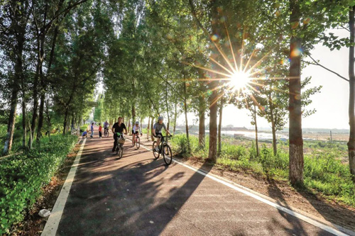 居民在河北省滄州市東光縣大運河畔騎行。攝影/新華社記者?駱學峰
