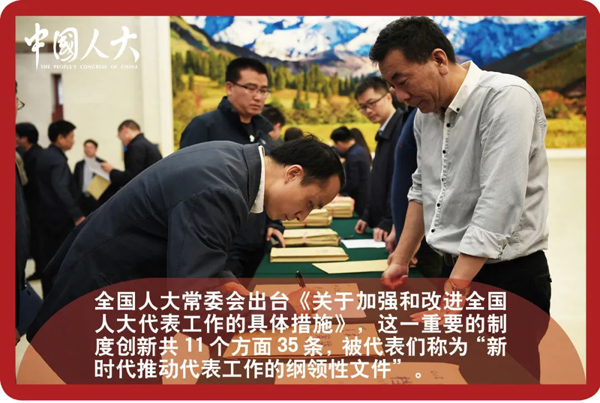 十三屆全國人大及其常委會履職以來,總結(jié)和把握代表工作規(guī)律,在支持和保障代表依法履職、充分發(fā)揮代表作用方面探索創(chuàng)新,做了大量工作,進一步完善制度機制。栗戰(zhàn)書委員長對代表議案建議工作高度重視,提出“內(nèi)容高質(zhì)量、辦理高質(zhì)量”和“既要重結(jié)果、也要重過程”的代表議案建議工作要求。2018年,委員長會議修改《全國人民代表大會代表建議、批評和意見處理辦法》。2019年,全國人大常委會出臺《關(guān)于加強和改進全國人大代表工作的具體措施》,這一重要的制度創(chuàng)新共11個方面35條,對做好代表工作提出全面、具體的要求,被代表們稱為“新時代推動代表工作的綱領(lǐng)性文件”。