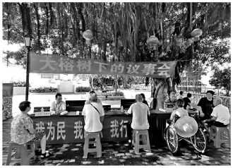 在廣東省江門市人大常委會(huì)“榕樹下議事會(huì)”上,市人大代表面對(duì)面聽取群眾意見建議。