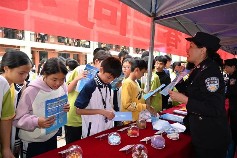 課室外,多部門聯(lián)合打造的“法治移動課堂”同步鋪開,形成全方位普法矩陣。在仿真毒品展示區(qū),禁毒民警結(jié)合新型毒品模型,揭露“跳跳糖”“奶茶粉”等偽裝手段,深刻警示學(xué)生警惕“第一口”誘惑;交警部門將流動宣傳車開進操場,循環(huán)播放本地交通事故警示片,血淋淋的案例讓圍觀學(xué)生直呼“安全帶就是生命帶”。