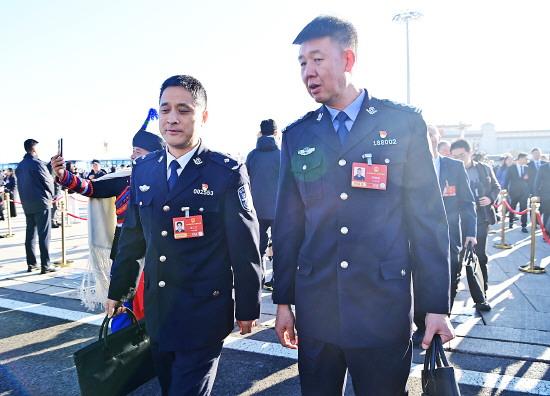 圖① 3月9日,十四屆全國人大四次會(huì)議第二次全體會(huì)議在北京人民大會(huì)堂舉行。圖為兩位公安代表步入會(huì)場(chǎng)。 本報(bào)記者 范瑞恒 攝