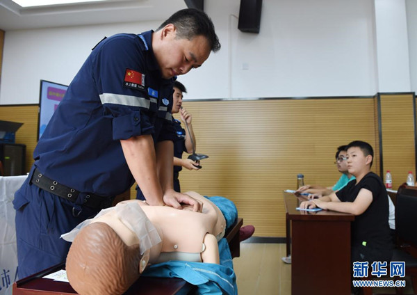 7月15日,在合肥市常青街道姚公社區(qū),合肥市水上應(yīng)急救援隊(duì)的隊(duì)員用現(xiàn)場演練的形式為孩子們介紹溺水后自救互救知識?!?/span>