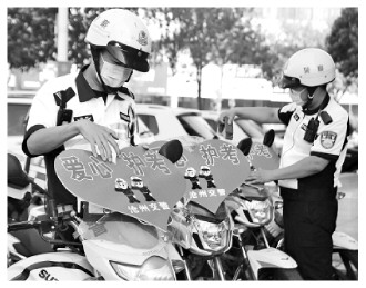 高考在即,河北省滄州市交警提前部署高考護(hù)考管控措施,為接送考生車輛“護(hù)航”。圖為滄州市公安交警支隊二大隊鐵騎交警為警用摩托車粘貼“愛心護(hù)考”標(biāo)識牌。