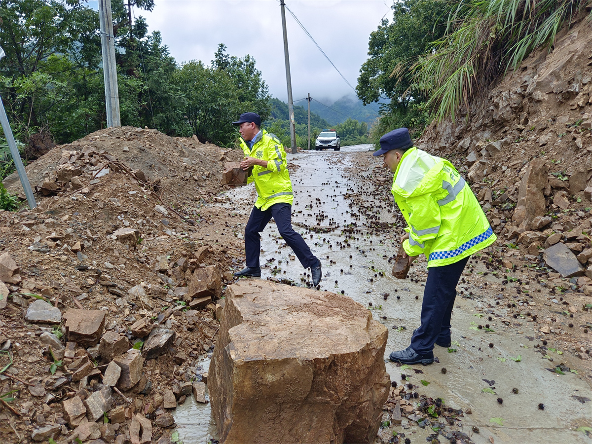 7月30日,受臺(tái)風(fēng)“杜蘇芮”影響,安徽省舒城縣公安局廬鎮(zhèn)派出所轄區(qū)突降暴雨,該所增派警力提高巡邏頻次,加強(qiáng)道路兩側(cè)地質(zhì)災(zāi)害檢查和路面障礙物清理,確保過往群眾生命財(cái)產(chǎn)安全和道路暢通。圖為民警在清理路面上障礙物。