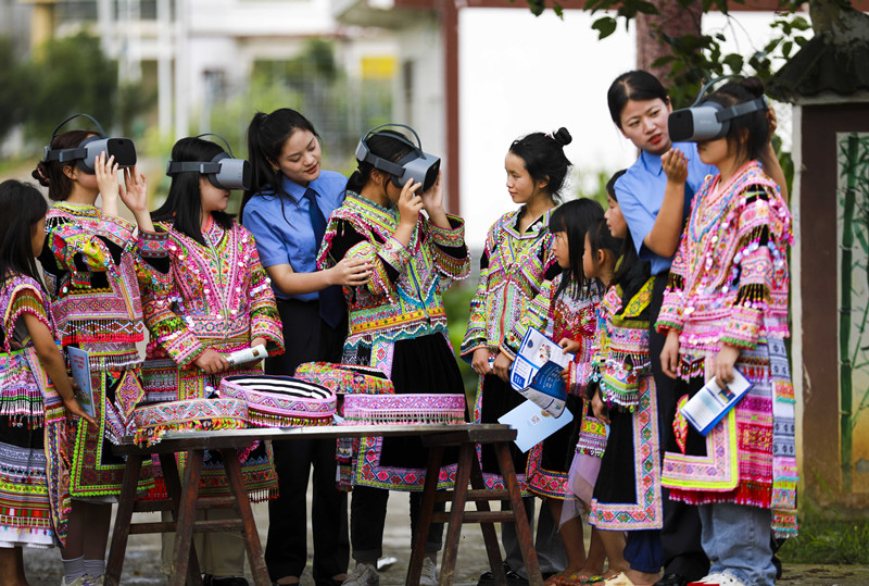 8月2日,貴州省黔西市人民檢察院檢察官來到協(xié)和鎮(zhèn)楊柳社區(qū)的苗寨里,開展“法治宣傳進苗寨”宣傳活動。圖為檢察官利用VR眼鏡,讓村民體驗吸毒對人體的危害。