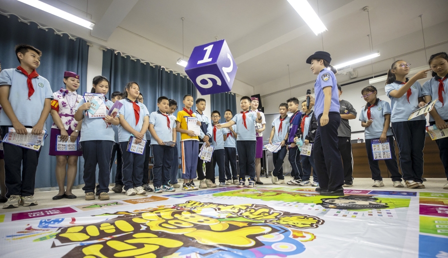 9月11日至17日,2023年國家網(wǎng)絡(luò)安全宣傳周在全國范圍內(nèi)統(tǒng)一開展。成都鐵路公安局重慶公安處組建安全宣傳小分隊到重慶科學(xué)城含谷中學(xué)校,針對網(wǎng)絡(luò)安全、電信詐騙、出行安全等,開展宣傳教育活動。圖為9月12日,民警組織學(xué)生開展“安全大富翁”互動游戲。