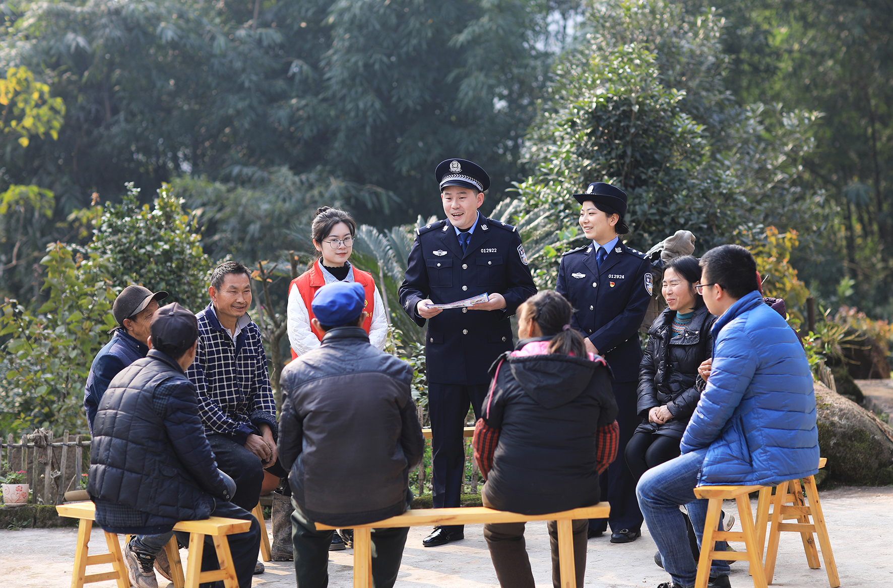 2023年12月27日,在貴州省赤水市官渡鎮(zhèn)玉皇村,民警和黨員志愿者在“院壩會”上向群眾普及防范電信網(wǎng)絡(luò)詐騙和道路交通安全知識。