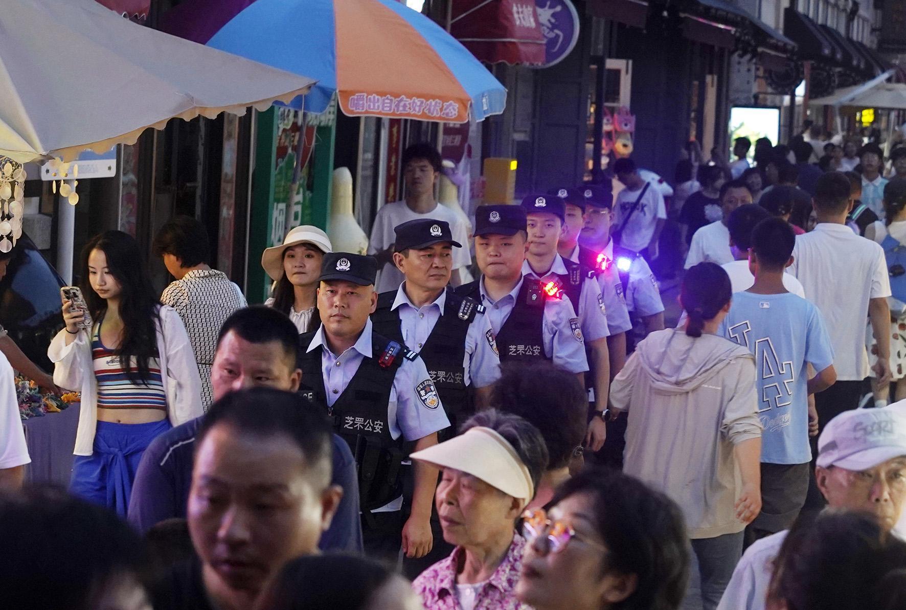 近日,山東省煙臺(tái)市公安局開展夏夜治安巡查宣防第二次集中統(tǒng)一行動(dòng),組織警力加大對(duì)景區(qū)、車站等人員密集區(qū)域的檢查和巡防力度,全力營(yíng)造安全穩(wěn)定的社會(huì)治安環(huán)境。圖為煙臺(tái)市公安局芝罘分局民警在朝陽街景區(qū)巡邏。