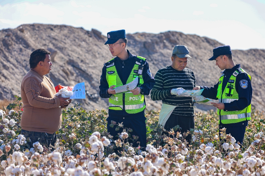 近日,烏魯木齊鐵路公安局喀什公安處在鐵路沿線轄區(qū)開展“秋收話安全·田間送宣傳”主題普法宣傳活動,向村民宣傳鐵路安全知識、反詐常識等,提升群眾的反詐、安全意識。圖為民警向村民講解鐵路安全知識。