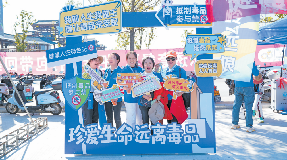 近日,江西省會昌縣公安局禁毒大隊以“贛閩粵徒步大會”為契機開展禁毒宣傳活動,通過展示仿真毒品、案例剖析等方式,向徒步愛好者和志愿者們介紹毒品的種類、危害,增強大家辨別毒品和抵御毒品的能力。圖為徒步愛好者在禁毒展區(qū)拍照打卡。