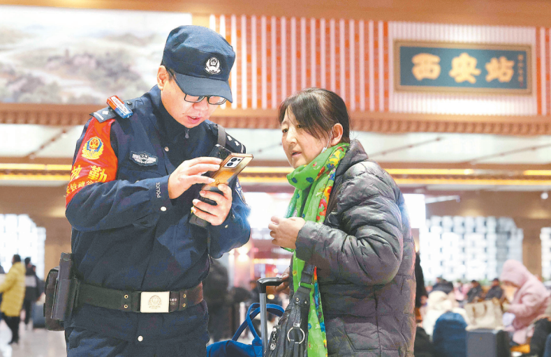 1月1日,西安鐵路公安局西安公安處民警堅(jiān)守崗位,護(hù)航旅客平安出行。圖為民警在西安火車站候車室?guī)椭每徒鉀Q問題。