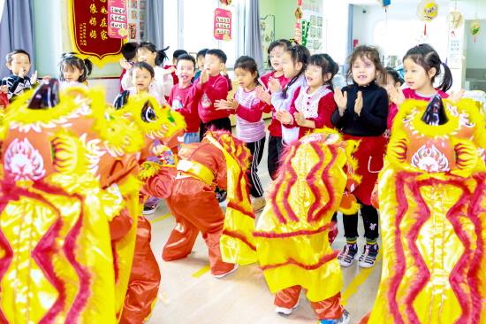 學(xué)前兒童學(xué)籍管理新規(guī)將在一定程度上約束家長,不讓孩子提前到其他機構(gòu)進行“填鴨式”學(xué)習(xí),從容度過幼兒園豐富多彩的生活。圖為新疆烏魯木齊市一所幼兒園的孩子們在舞獅子,樂享冬日時光。 CFP供圖