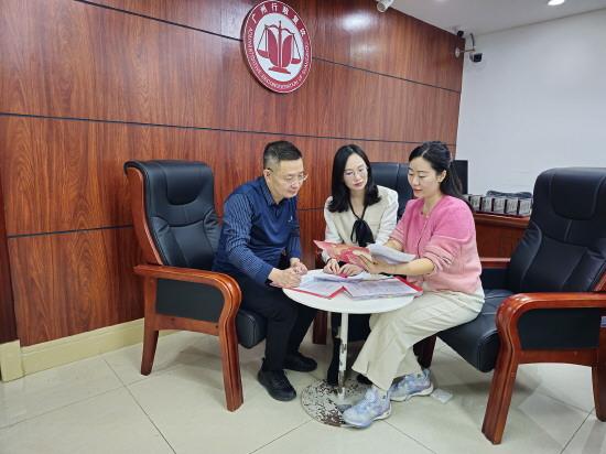 圖為周秋妤(右一)和同事一起對疑難復雜案件進行合議,研究實質化解行政爭議路徑。 廣州市司法局供圖