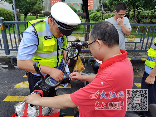 “同志,請把這張?zhí)嵝褬撕炠N在你電動自行車的前面,時刻提醒你戴上頭盔?!?月5日,南昌市紅谷灘區(qū)鳳凰南大道上,紅谷灘交警大隊二中隊民警李黎正在勸導騎電動自行車的市民佩戴頭盔。除了對未佩戴頭盔的車主進行警示教育外,他還在每輛電動自行車顯眼位置貼上提醒標簽。