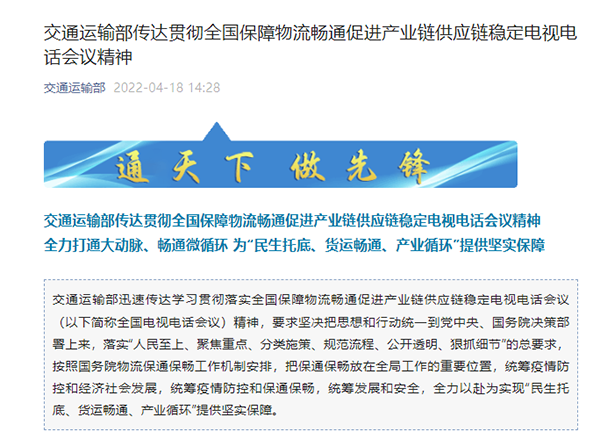 原標(biāo)題:交通運(yùn)輸部傳達(dá)貫徹全國(guó)保障物流暢通促進(jìn)產(chǎn)業(yè)鏈供應(yīng)鏈穩(wěn)定電視電話會(huì)議精神