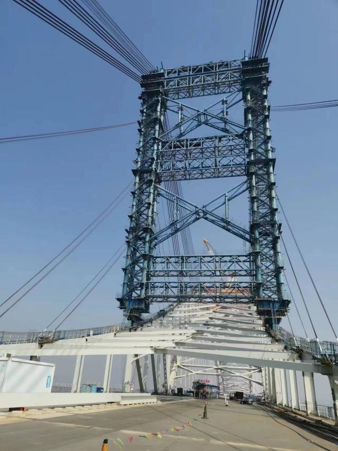 登上懸于江面60米的大橋在建主航道橋面,一排排“N”形鋼桁梁呈現(xiàn)在記者眼前。據(jù)介紹,鋼桁梁制造完成后將運(yùn)至橋位處整體吊裝,吊裝時(shí)需要將鋼桁梁平穩(wěn)提升到江面以上60米,最大吊裝重量超過1700噸。為滿足橋梁建設(shè)模塊大型化發(fā)展的新需求,項(xiàng)目團(tuán)隊(duì)研制了2000噸級全球最大噸位橋面吊機(jī),用于主航道橋鋼桁梁架設(shè)?!霸摰鯔C(jī)集成了可視化吊裝系統(tǒng)、智能調(diào)位及快速定位系統(tǒng)、自動(dòng)倒換軌道及行走控制系統(tǒng)、輔助掛索等功能于一體,是橋面吊機(jī)制造史上一次重要突破?!蓖踺x介紹說,該吊機(jī)最大起重量為2000噸,最大起升高度80米,吊幅為13到23米之間,相當(dāng)于能一次性將1400臺(tái)小汽車吊至25層樓的高度。