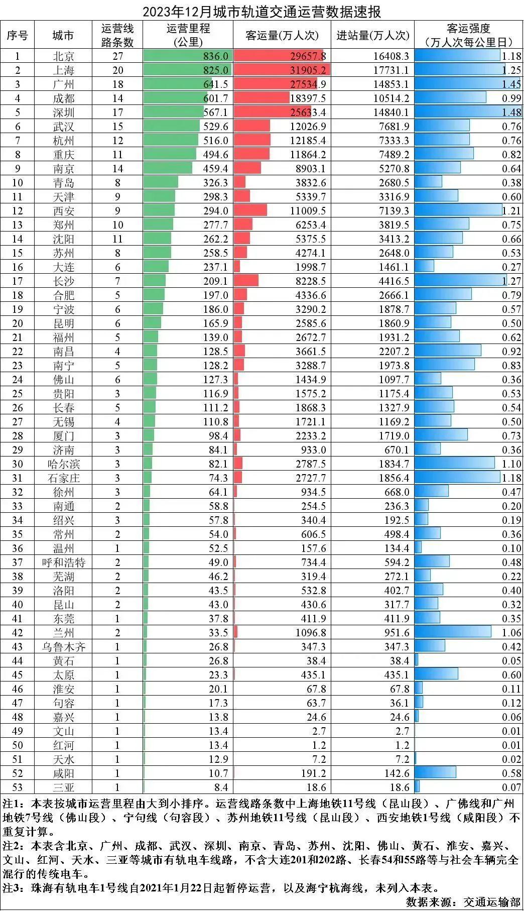 2023年12月,31個(gè)?。ㄗ灾螀^(qū)、直轄市)和新疆生產(chǎn)建設(shè)兵團(tuán)共有55個(gè)城市開(kāi)通運(yùn)營(yíng)城市軌道交通線路306條,運(yùn)營(yíng)里程10165.7公里,實(shí)際開(kāi)行列車333萬(wàn)列次,完成客運(yùn)量26.7億人次,進(jìn)站量16億人次。12月份,客運(yùn)量環(huán)比增加0.8億人次,增長(zhǎng)3.2%,同比增加15.1億人次,增長(zhǎng)130.1%,較2019年月均客運(yùn)量增加6.8億人次,增長(zhǎng)34%。12月份全國(guó)總運(yùn)營(yíng)里程的平均客運(yùn)強(qiáng)度為0.863萬(wàn)人次每公里日,較2019年全國(guó)總運(yùn)營(yíng)里程的平均客運(yùn)強(qiáng)度降低18.6%。