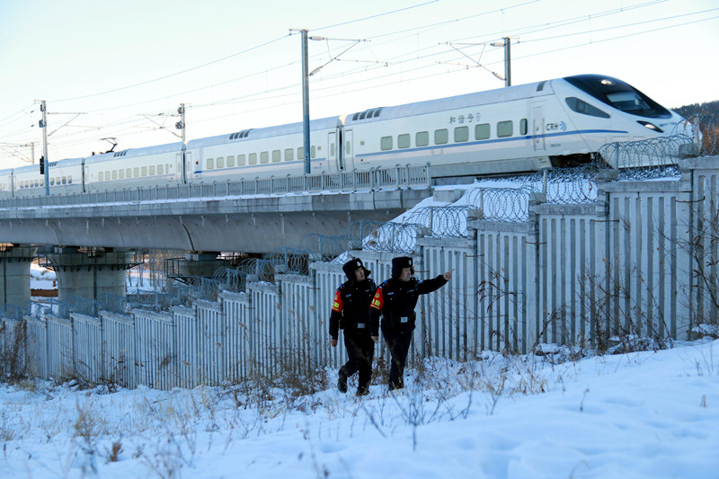1月20日,哈爾濱鐵路公安局牡丹江鐵路公安處海林北站派出所民警正在開展線路隱患排查。 梅華英杰 攝