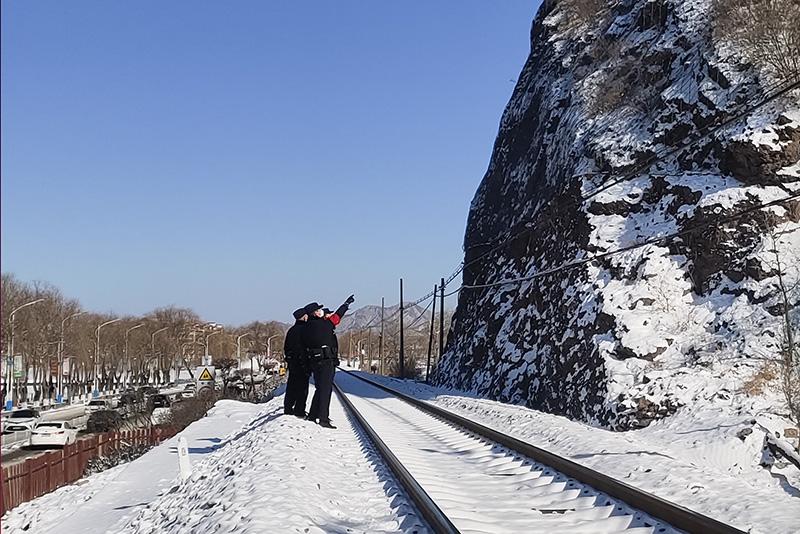 大風(fēng)天承接雨雪天,京承鐵路線上,呼嘯的寒風(fēng)吹起地面積雪,雪沫拍打在臉上冰涼刺骨。承德站派出所所長會亞君帶領(lǐng)民警來到線路的一處山體旁,“雨雪天開展線路督導(dǎo)檢查,要確保線路設(shè)備設(shè)施運(yùn)轉(zhuǎn)正常,還要防止周圍山體松動,落石影響行車”,會亞君告訴記者,在雪地里踏著石渣行進(jìn)很慢,一兩個(gè)小時(shí)身上就開始出汗,山風(fēng)一吹就更冷了。