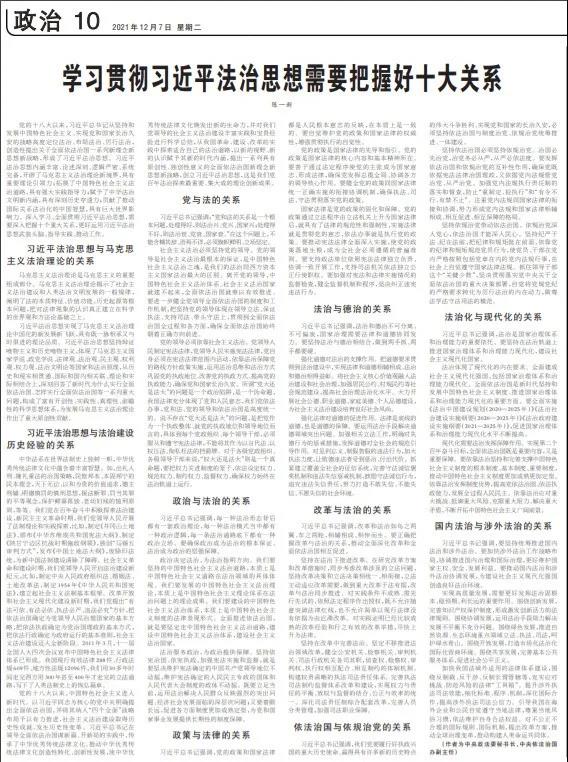 12月7日,人民日報刊發(fā)中央政法委秘書長、中央依法治國辦副主任陳一新學習貫徹習近平法治思想的署名文章,從習近平法治思想與馬克思主義法治理論的關(guān)系、習近平法治思想與法治建設(shè)歷史經(jīng)驗的關(guān)系、黨與法的關(guān)系、政治與法治的關(guān)系、政策與法律的關(guān)系、法治與德治的關(guān)系、改革與法治的關(guān)系、依法治國與依規(guī)治黨的關(guān)系、法治化與現(xiàn)代化的關(guān)系、國內(nèi)法治與涉外法治的關(guān)系等十個方面,系統(tǒng)闡述如何學習貫徹習近平法治思想的精髓要義。長安君為大家?guī)砦恼氯摹?/span>