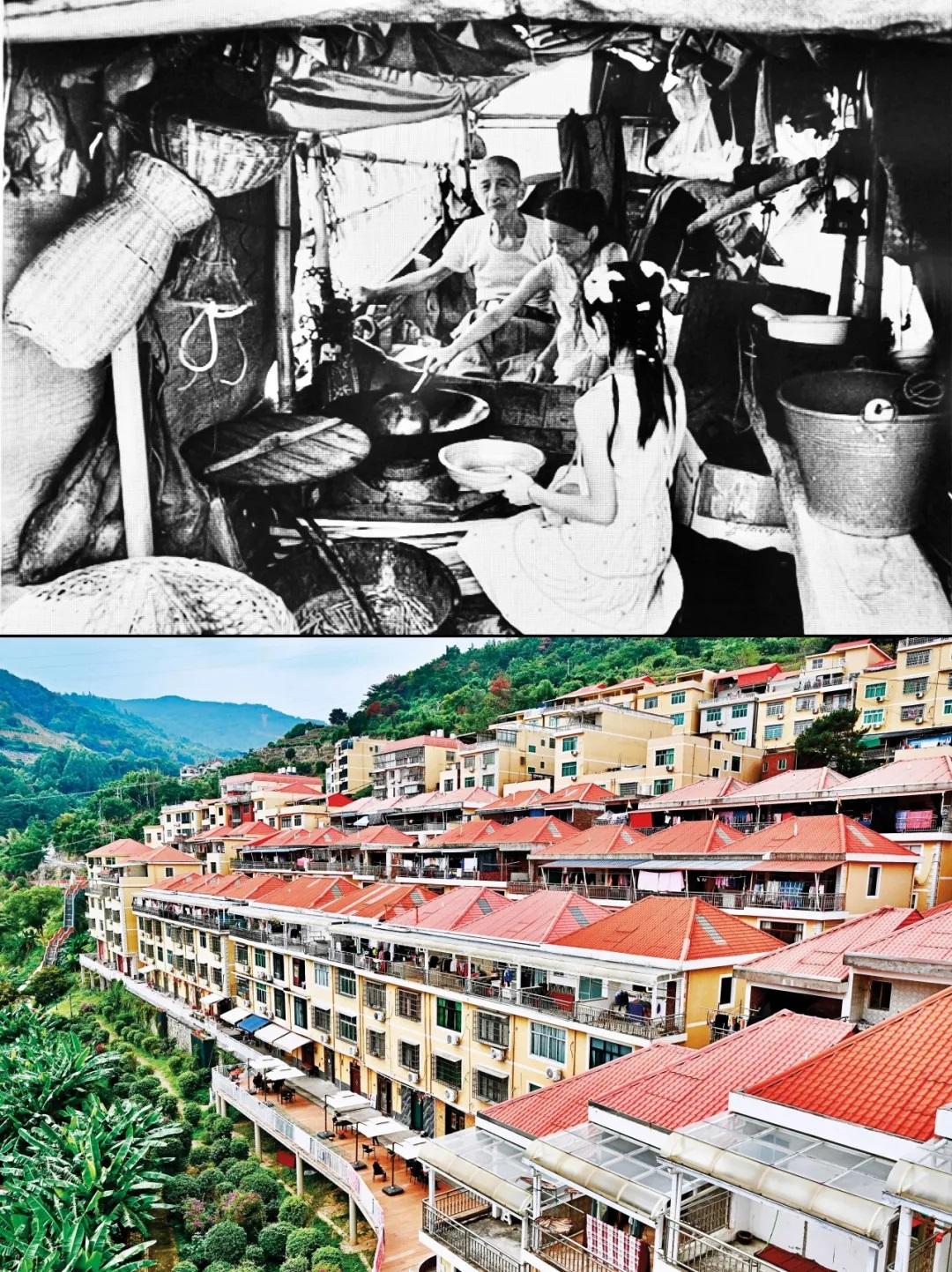 在福建省寧德市福安市下岐村,歷史上,村民祖祖輩輩以在淺海灘涂“討小海”為生,一條小木船就是幾代人的家,生活條件異常艱苦,被稱為“連家船民”。20世紀(jì)90年代,福建“造福工程”啟動(dòng),下岐村采取“分期分批,全面搬遷”的辦法,將2000多名漁民安置上岸。如今的下岐村,成排的小洋樓矗立,漁民廣場(chǎng)、白馬公園等休閑設(shè)施一應(yīng)俱全,呈現(xiàn)出一幅百姓安居樂業(yè)的現(xiàn)代鄉(xiāng)村圖景。圖為拼版照片:上圖為20世紀(jì)80年代福建寧德地區(qū)的連家船民生活場(chǎng)景(資料照片);下圖為2023年11月15日拍攝的下岐村(新華社記者 姜克紅/攝)。 新華社發(fā)