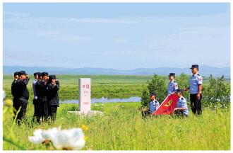 圖為內(nèi)蒙古自治區(qū)呼倫貝爾邊境管理支隊(duì)額爾古納邊境管理大隊(duì)室韋邊境派出所民警和護(hù)邊員在110號界碑旁重溫入黨誓詞。 李永建 攝
