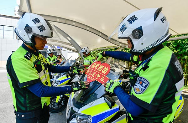 6月6日,山東省棗莊市臺兒莊公安分局交警大隊民警在車輛上粘貼愛心送考標識。今年高考期間,山東省棗莊市臺兒莊公安分局交警大隊組織了14輛“愛心送考車”在高考考點疏導(dǎo)交通,處理突發(fā)事件,為考生愛心護考。
