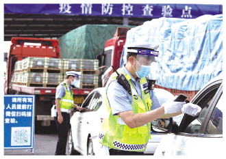 圖⑥ 民警在隴海路西路高速公路站口檢查司乘人員的核酸檢測證明。