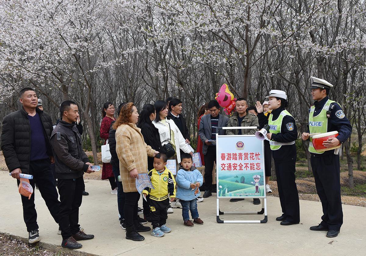 3月29日,安徽省安慶市宿松縣公安局交警大隊(duì)民輔警深入轄區(qū)櫻花園等景點(diǎn),對(duì)自駕游游客開展交通安全提示,發(fā)放安全提示卡。圖為該大隊(duì)民輔警采取交通安全“大鼓書”的形式宣傳旅游交通安全常識(shí)。