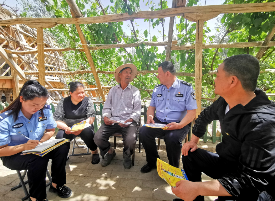 圖為和田市公安局黨員民警志愿服務(wù)隊(duì)的民警在古江巴格鄉(xiāng)紅星村,向村民開(kāi)展防范電信網(wǎng)絡(luò)詐騙知識(shí)普法宣傳。