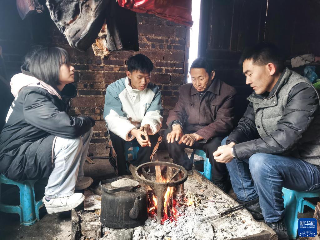 貴州省望謨縣實(shí)驗(yàn)高中黨總支副書記、副校長(zhǎng)劉秀祥(右一)在學(xué)生家中家訪(2022年2月1日攝)。新華社發(fā)