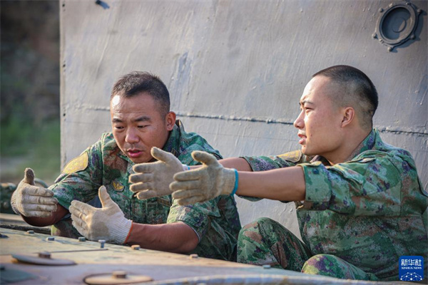 陸軍第71集團軍某旅“濟南英雄連”連長孫金龍(左)向步戰(zhàn)車駕駛員請教專業(yè)知識(2022年9月18日攝)。新華社發(fā)(黃振宇 攝)