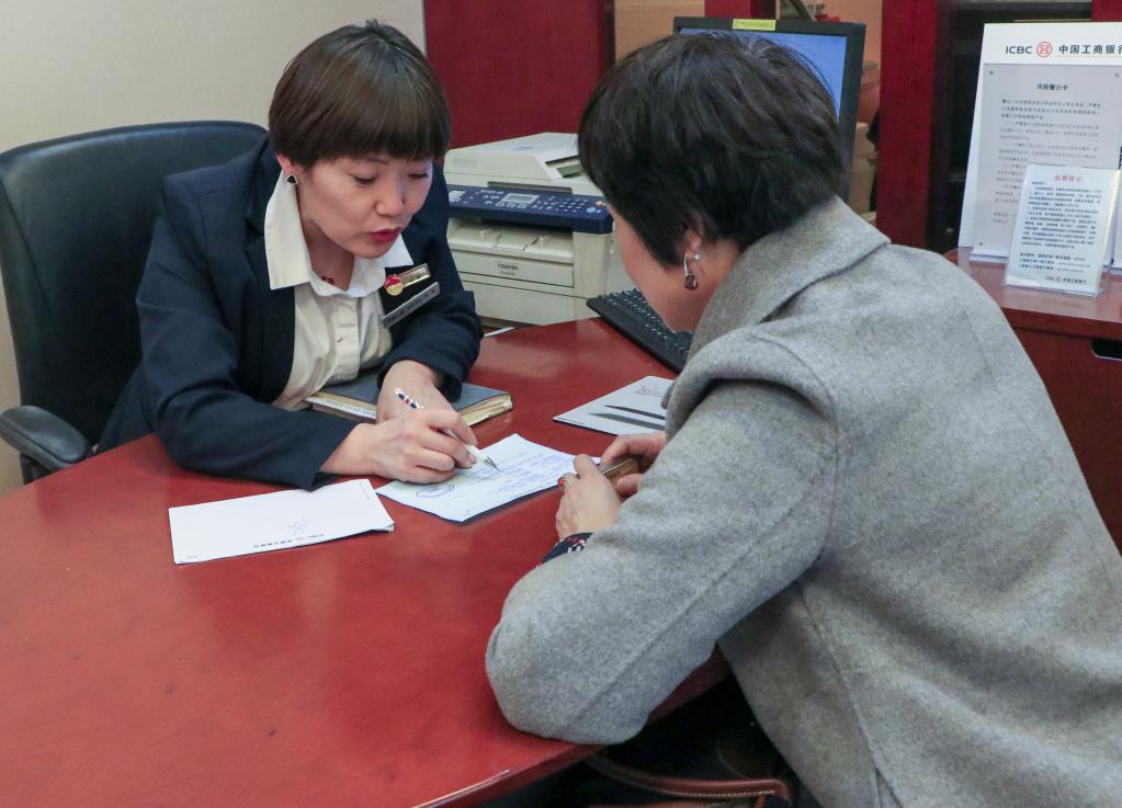 在中國(guó)工商銀行新疆烏魯木齊的一處營(yíng)業(yè)網(wǎng)點(diǎn),李鵬(左)為客戶解答問(wèn)題(2018年11月攝)。新華社發(fā)