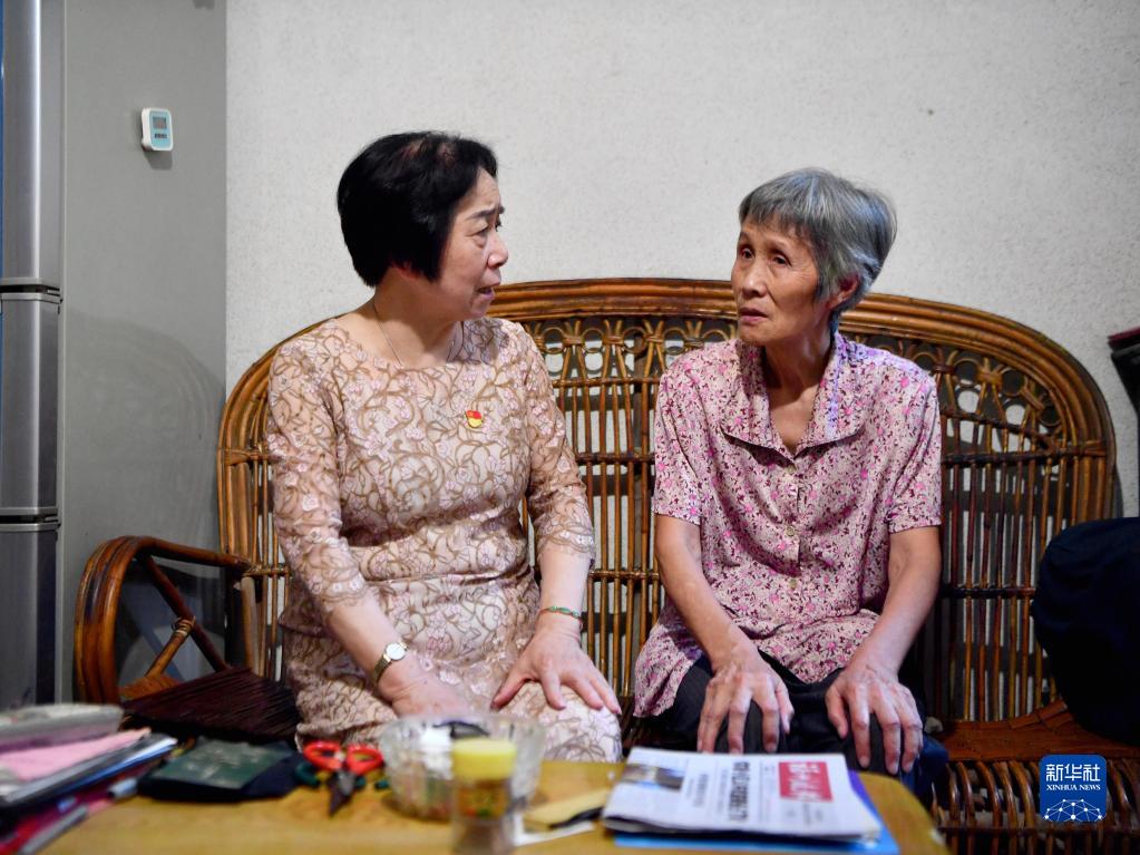 福建省福州市軍門社區(qū)黨委書記林丹(左)在居民高珠英家走訪,了解老人生活情況(2022年9月15日攝)。新華社記者 姜克紅 攝