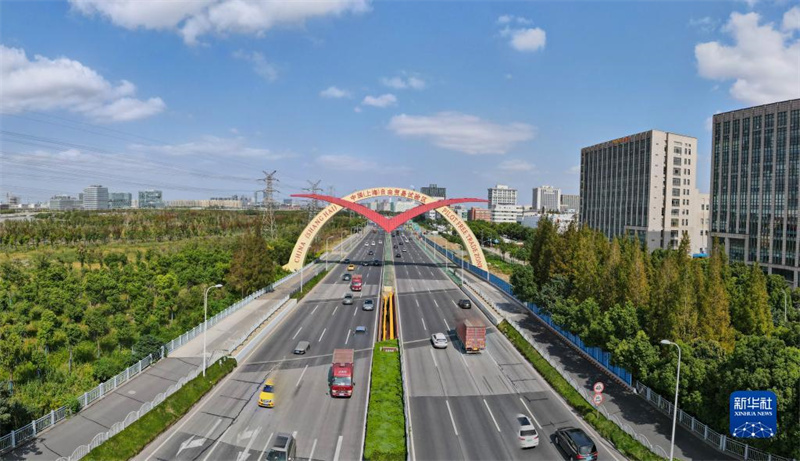 這是中國(guó)(上海)自由貿(mào)易試驗(yàn)區(qū)保稅片區(qū)的標(biāo)志性景觀“海鷗門”(10月17日攝,無(wú)人機(jī)照片)。新華社記者 方喆 攝