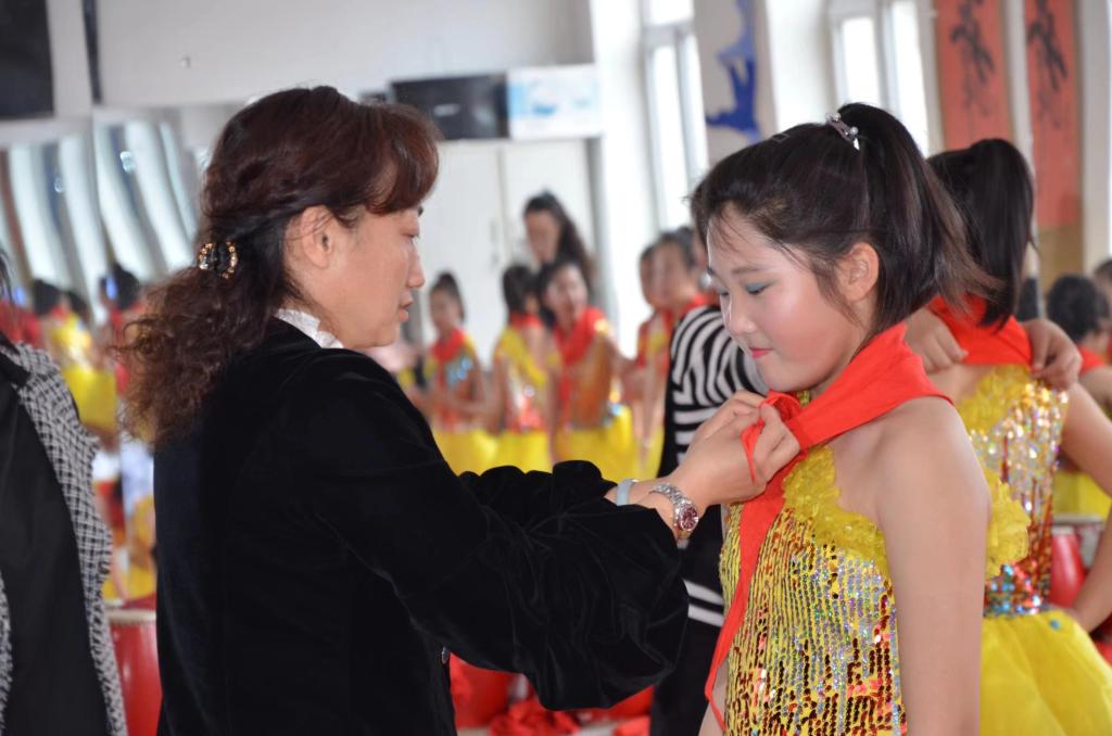 秦穎(左)為演出前的學(xué)生戴好紅領(lǐng)巾。