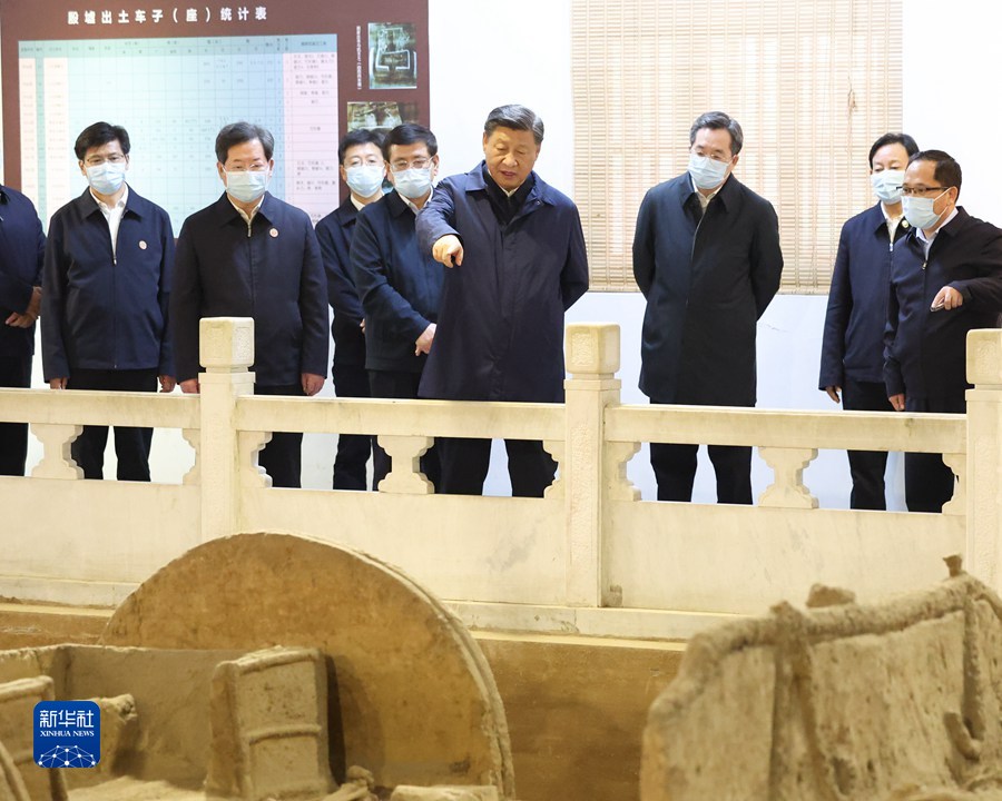 28日下午,習(xí)近平考察了位于安陽市西北郊洹河南北兩岸的殷墟遺址。殷墟是我國(guó)歷史上第一個(gè)文獻(xiàn)可考、為考古發(fā)掘所證實(shí)的商代晚期都城遺址。習(xí)近平步入殷墟博物館,仔細(xì)觀摩青銅器、玉器、甲骨文等出土文物。隨后,習(xí)近平來到車馬坑展廳,察看商代畜力車實(shí)物標(biāo)本和道路遺跡。他指出,殷墟出土的甲骨文為我們保存3000年前的文字,把中國(guó)信史向上推進(jìn)了約1000年。殷墟我向往已久,這次來是想更深地學(xué)習(xí)理解中華文明,古為今用,為更好建設(shè)中華民族現(xiàn)代文明提供借鑒。中國(guó)的漢文字非常了不起,中華民族的形成和發(fā)展離不開漢文字的維系。在這方面,考古事業(yè)居功至偉??脊殴ぷ饕^續(xù)重視和加強(qiáng),繼續(xù)深化中華文明探源工程。中華文明源遠(yuǎn)流長(zhǎng),從未中斷,塑造了我們偉大的民族,這個(gè)民族還會(huì)偉大下去的。要通過文物發(fā)掘、研究保護(hù)工作,更好地傳承優(yōu)秀傳統(tǒng)文化。習(xí)近平強(qiáng)調(diào),中華優(yōu)秀傳統(tǒng)文化是我們黨創(chuàng)新理論的“根”,我們推進(jìn)馬克思主義中國(guó)化時(shí)代化的根本途徑是“兩個(gè)結(jié)合”。我們要堅(jiān)定文化自信,增強(qiáng)做中國(guó)人的自信心和自豪感。
