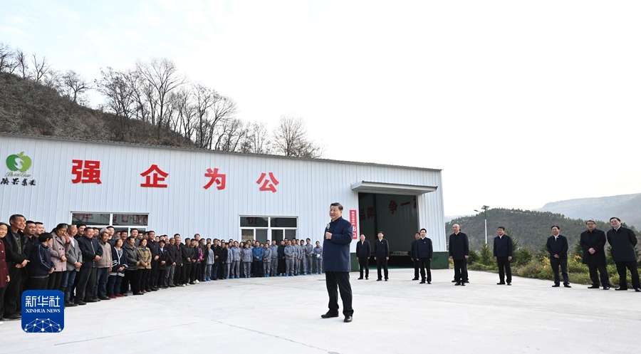 10月26日至28日,中共中央總書記、國(guó)家主席、中央軍委主席習(xí)近平在陜西省延安市、河南省安陽市考察。這是26日下午,習(xí)近平在延安市安塞區(qū)高橋鎮(zhèn)南溝村蘋果洗選車間外,同老鄉(xiāng)們拉家常。 新華社記者 燕雁 攝