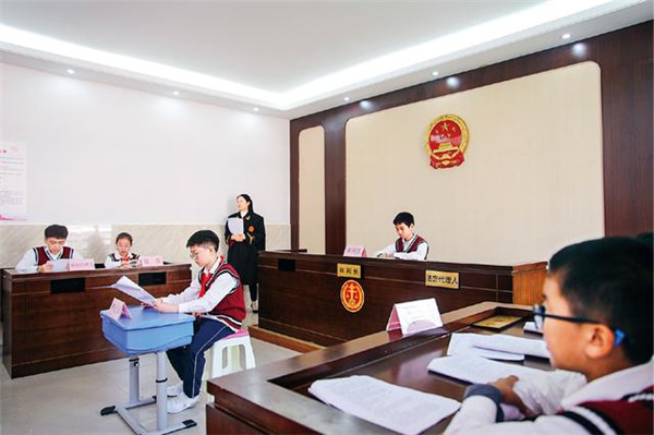 2020年10月30日,安徽省合肥市濱湖世紀(jì)社區(qū)在合肥師范附小三小開(kāi)展“模擬法庭進(jìn)校園”活動(dòng)。圖為當(dāng)日拍攝的模擬法庭“庭審”現(xiàn)場(chǎng)。新華社記者 曹力/攝