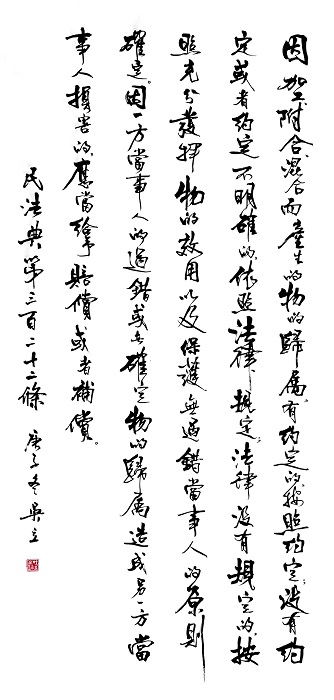 民法典第三百二十二條 因加工、附合、混合而產(chǎn)生的物的歸屬,有約定的,按照約定;沒(méi)有約定或者約定不明確的,依照法律規(guī)定;法律沒(méi)有規(guī)定的,按照充分發(fā)揮物的效用以及保護(hù)無(wú)過(guò)錯(cuò)當(dāng)事人的原則確定。因一方當(dāng)事人的過(guò)錯(cuò)或者確定物的歸屬造成另一方當(dāng)事人損害的,應(yīng)當(dāng)給予賠償或者補(bǔ)償。