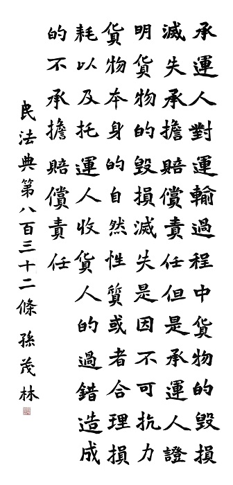 民法典第八百三十二條 承運(yùn)人對(duì)運(yùn)輸過程中貨物的毀損、滅失承擔(dān)賠償責(zé)任。但是,承運(yùn)人證明貨物的毀損、滅失是因不可抗力、貨物本身的自然性質(zhì)或者合理?yè)p耗以及托運(yùn)人、收貨人的過錯(cuò)造成的,不承擔(dān)賠償責(zé)任。