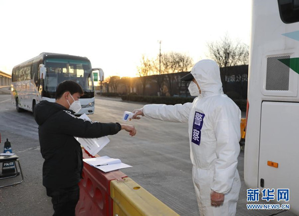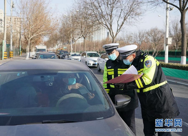 1月10日,石家莊市公安局裕華區(qū)交通警察大隊民警檢查外出車倆和人員的證件?!?/span>