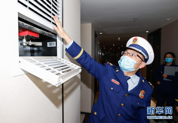 2月1日,消防監(jiān)督檢查人員在商務(wù)酒店內(nèi)現(xiàn)場測試排煙口風(fēng)量?!?/span>