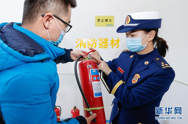2月1日,消防監(jiān)督檢查人員在購物商場內(nèi)對滅火器壓力進(jìn)行檢查。