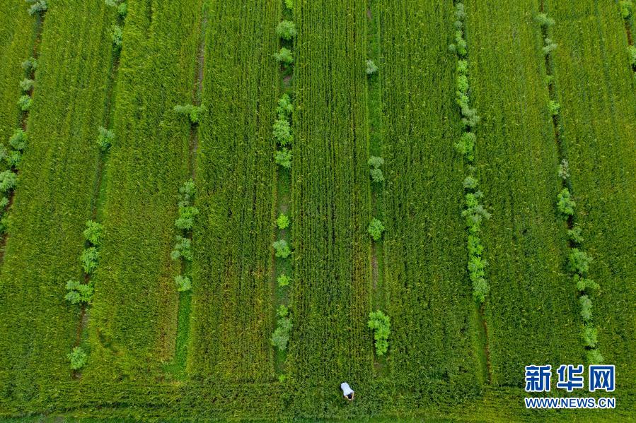 2020年6月23日,在四平市梨樹縣孤家子鎮(zhèn),忠元種植農(nóng)民專業(yè)合作社理事長宋忠元查看小冰麥長勢(無人機照片)。新華社記者 張楠 攝