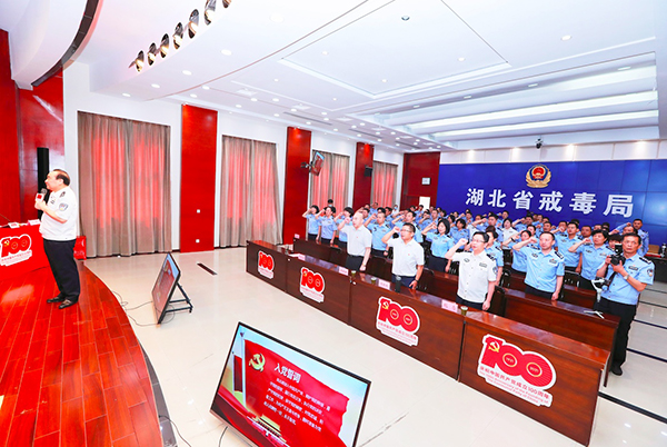 賽前,全體黨員民警、職工高舉起右拳,面對(duì)鮮紅黨旗,在湖北省戒毒局黨委書記、局長(zhǎng)何選才帶領(lǐng)下,重溫入黨誓詞,表達(dá)了為黨的事業(yè),為新時(shí)代中國(guó)特色社會(huì)主義偉大實(shí)踐奮斗終生的堅(jiān)定決心。