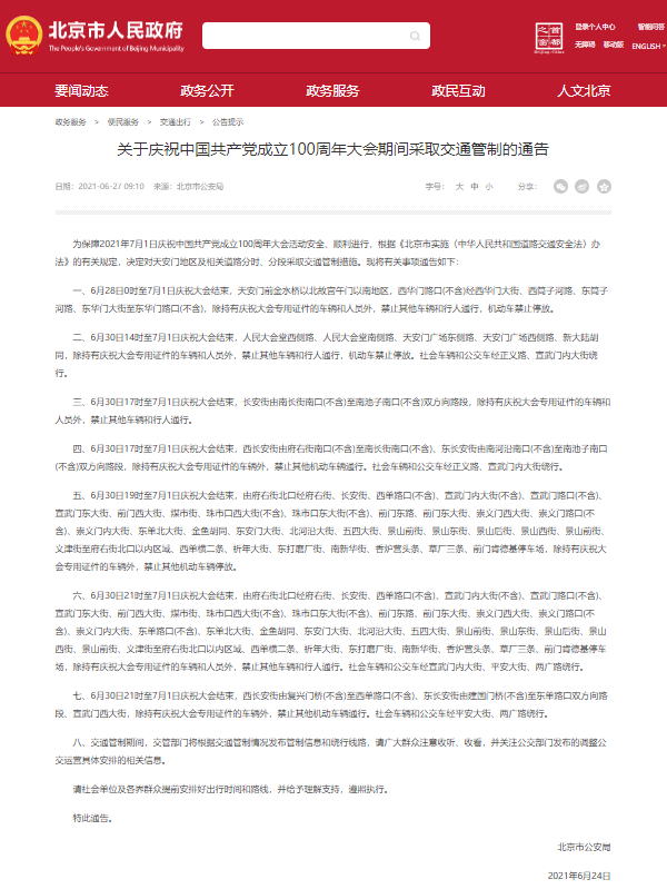 原標(biāo)題:關(guān)于慶祝中國共產(chǎn)黨成立100周年大會(huì)期間采取交通管制的通告